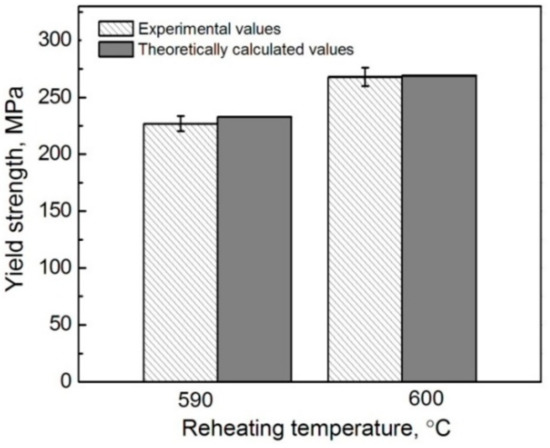 Substituting Vp in Formulas (1), (3), and (4) by , expressed by Formula (7), then incorporating Formulas (2)–(5) into Formula (1), and finally taking the data in Table 3 and Table 4 into Formula (1), the YS values of the composites thixoformed at different reheating durations can be obtained. It is noted that only the shells in the composites formed at 590 °C and 600 °C are compact, so the YS values of these two composites were calculated. As shown by Figure 15, the calculated values are well consistent to the experimental ones, which further confirms that the modified MSL model is actually suitable to predict the YS of this kind of composite, and especially, the considered strengthening mechanisms such as GR, GND, TMS, and SS are also reasonable.