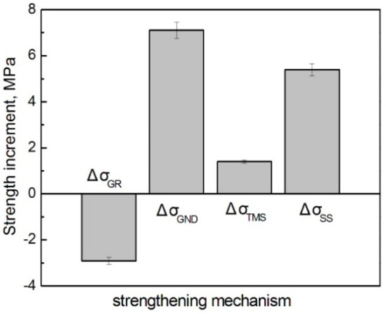 where σ0 is the YS of unreinforced matrix alloy; Vp and S is the volume fraction and aspect ratio of reinforcements respectively; ΔσGR, ΔσGND, ΔσTMS, ΔσSS, and ΔσOR are the strength increments resulted from grain refinement (GR), geometrically necessary dislocations (GND), thermal mismatch strain (TMS), solid solution (SS), and Orowan strengthening (OS), respectively, due to the introduction of reinforcements, and are presented as [29,30]: