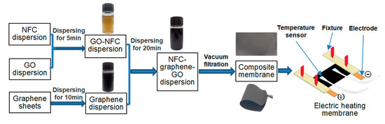 It is clear that endowing graphene and graphene-based composites with electric heating functions has much promise; however, there are few systematic studies focusing on the electric heating performance. While polymer substrates such as polydimethylsiloxane [6] and epoxy resin [5] were used in the above works, graphene material can be fabricated directly into membranes by printing [4], chemical vapor deposition (CVD) [10], or spin coating [11]. However, membranes or other lamellar materials constituted from graphene or RGO without sufficient polar groups at the surface would deteriorate under heat, load, or deformation, etc. To make up for these deficiencies, nanofibrillated cellulose (NFC) is often added to graphene composites for better heat stability, suppleness [14], and tensile strength [15] in reinforcing materials [16], sensing elements [14], and capacitor electrodes [17]. Besides, some other polymers such as polybenzimidazole with outstanding thermal and mechanical stability had been recently used for graphene functional composite [18]. However, NFC, as an abundant natural polymer, has an excellent capacity for forming self-assembled monolayers due to its high surface area, abundant polar groups, and high length-diameter ratio [19]. These monolayers can be combined with GO by hydrogen bonds to form a 3D network [15], thus forming a favorable structure for the homodispersion of graphene-GO-NFC systems. It can be concluded that NFC facilitates and stabilizes the system’s homodispersion [20,21].