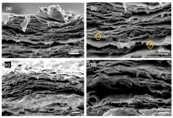 Figure 6 showed a layered structure laminated by graphene sheets in the cross-section of the membranes, and similarly observed morphology have been also demonstrated in previous study [15,26,29]. This was attributed to the binding action of GO and NFC, which embedded among the graphene flakes, gluing them together. The fractured cross-sections were coarse, with a fibrillous torn morphology, indicating that there was strong adhesion among NFC, graphene, and GO in the membrane [15]. Consequently, it can be concluded that the NFC binder facilitated the construction of a 3D framework, and GO and graphene sheets were laminated in a disordered manner within the framework, which endowed the membrane with mechanical support.