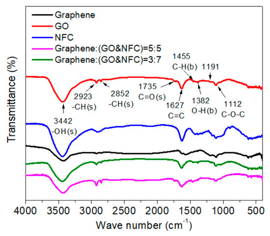 As shown in Figure 7, a broad and strong absorption peak centered around 3442 cm−1 is present, which corresponds to the stretching vibration of the –OH group in the GO and NFC samples [30,31]. The strength of this peak, as well as those of the C–O–C group located at 1191 and 1112 cm−1, was reduced in the presented composite membranes, which indicated that more intermolecular hydrogen bonds formed in the membrane with the –OH groups in GO and NFC [32]. Otherwise, the peaks at 2923 and 2852 cm−1, which correspond to the C–H group, were stronger for GO and the composite membrane than for NFC, whereas the peak at 1455 cm−1, which corresponds to the C–H deformation mode [31], exhibited more obviously for the graphene and composite membrane than for GO and NFC in Figure 7. Finally, C=C stretching vibration at 1627 cm−1 was present for GO, NFC, the composite membrane, and graphene.