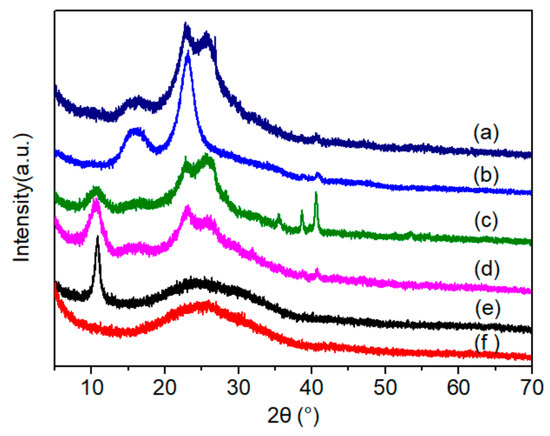 The characteristic reflections (2θ = 10.8°) of the GO membrane (Figure 11e) shows the lamellar spacing d as 0.819 nm according to Bragg’s diffraction formula [34,37]. In the composite membrane, after GO was crosslinked with NFC and graphene, the peak downshifted to 10.62° (d spacing = 0.832 nm) and became gentle, and was indistinguishable as the amount of GO decreased to 5 wt.%, due to the disruption caused by the added NFC and graphene. Hence the ordered layers of GO, which include oxygen-containing groups, are expected to be partly diverged [15,34].