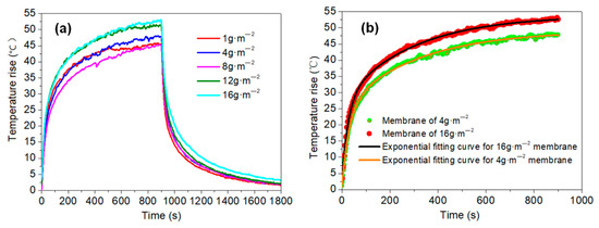 (a) Temperature rise of membranes with various grammages; (b) Exponential fitting of the 4 and 16 g·m−2 membranes.