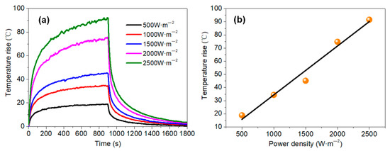 As shown in Figure 14, the temperature of the membrane rose quickly for the first 300 s, and then tended to stabilize. As the power density increased, the temperature rise of the membrane increased linearly, which can be illustrated from the fitting analysis results (y = −2.76 + 0.03716x; R2 = 0.98863; in which y is the temperature rise, and x is power density). Thus, a temperature rise of 90 °C can be achieved by applying 2500 W·m−2 power density (the electrical parameters are shown in Table S3, Supplementary Materials).
