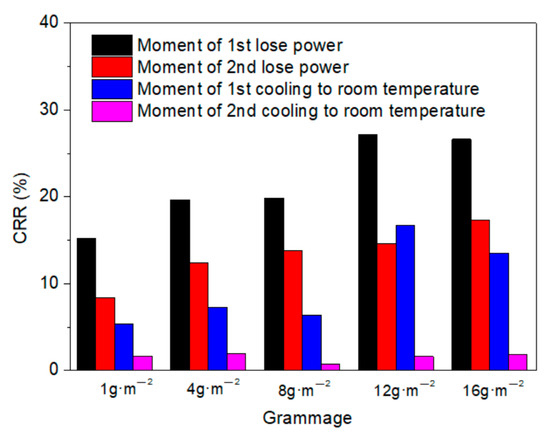 The resistance stability in the power on process can be seen in Figure 15. For the 1 g·m−2 membrane, the CRR values at the moment the power was lost and after cooling to room temperature were 15.19% and 5.40% in first heating test, and 8.38% and 1.62% in the second test, respectively. As the grammage of the membrane increased to 16 g·m−2, the CRR values were 26.4% and 13.53% in the first test, and 17.34% and 1.83% in the second test, respectively. A larger CRR value was observed at the moment the power was lost, which decreased distinctly between the first and second tests. The CRR at the moment power was lost showed a linear relation with grammage, which contributes to the ability to control the real power when a current is applied. After cooling to room temperature, the CRR value declined more obviously, but there were only minor differences among the membranes with different grammages. This indicates that the stability of the conductive structure in the membrane increased after the first annealing test.