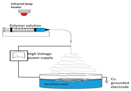 The 12 wt.% solutions in the solvent mixture were prepared by dissolving various weight ratios of EVA and PLA granules (100:0, 80:20, 60:40, 40:60, 20:80, 0:100) in DCM. According to a previous report [21], acetone was added for the enhanced conductivity of the solutions. The DCM/acetone ratio was set at 70:30 v/v. The solutions were intensively stirred on a magnetic plate for few hours. Polymers solutions were electrospun from a 5 mL syringe with a metallic needle at the flow rate of 1.5 mL/h. The electrospinning parameters were fixed. A high voltage of 14–15 kV was applied, and the fibers were collected on a distilled water surface containing a copper counter electrode at a distance of 15 cm from the needle tip. The EVA copolymer is not highly soluble at laboratory temperature; therefore, an infrared lamp (Figure 1) was used to heat the polymer solution, as previously described [15,22]. The temperature was controlled by a thermocouple and adjusted to 37 °C.
