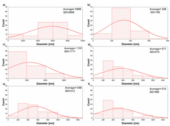 Histogram of the diameter distribution calculated from 100 random fiber measurements: (a) pure EVA, (b) pure PLA, (c) EVA/PLA 80:20, (d) EVA/PLA 60:40, (e) EVA/PLA 40:60, and (f) EVA/PLA 20:80, average value in nm, and standard deviation (SD).