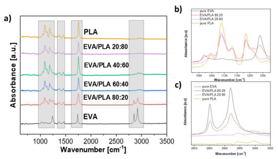 (a) FTIR spectra of the prepared mats samples of pure EVA, EVA/PLA 80:20, EVA/PLA 60:40, EVA/PLA 40:60, EVA/PLA, and pure PLA. Details of selected samples spectra (b) 970–1280 cm−1 and (c) 2790–3050 cm−1.