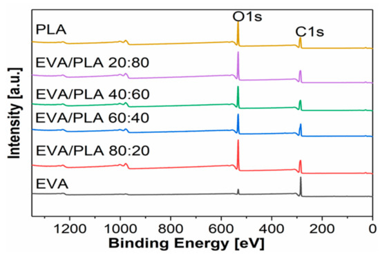 XPS survey spectra of prepared mats samples of pure EVA, EVA/PLA 80:20, EVA/PLA 60:40, EVA/PLA 40:60, EVA/PLA 20:80, and pure PLA.