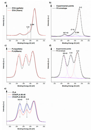 Thermo Scientific K-Alpha XPS system (Thermo Fisher Scientific, East Grinstead, UK) equipped with a micro-focused, monochromatic Al Kα X-ray source (1486.6 eV) was used to collect X-ray photoelectron spectra (XPS) of electrospun fibers and also pure EVA and PLA pellets. The constant analyzer energy mode with the pass energy of 200 eV was applied for obtaining the survey scan, narrow regions were collected with the pass energy of 50 eV. For the charge compensation, a flood gun was used. For digital acquisition and data processing, Thermo Scientific Avantage software was used (version 5.988, Thermo Fisher Scientific, East Grinstead, UK).