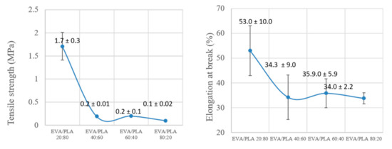 The mechanical properties of a prepared material is essential data for its application. EVA is a flexible elastomer; however, it is not easily electrospun. The mechanical testing of pure electrospun EVA was not possible due to the infirmity of the sample. The weakness of the electrospun EVA compared to the blended EVA/PLA could be caused by partial degradation on the ethylene groups as revealed by XPS. It is also known that PLA is a brittle polymer when it is prepared in the form of a film or electrospun mats. The brittleness of PLA, compared to the blend and the presence of beads in the sample (Figure 2), leads to an impossibility for mechanical testing. From the literature, it is known that with a combination of EVA with PLA at a ratio 80:20, it is possible to create a tough blend [7]. In this case, samples in the form of films were investigated. It can be explained as strong interfacial adhesion between EVA and PLA [30] caused by the elastomeric nature of EVA. The enhanced mechanical properties due to the higher content of PLA can be explained as enhancing the flexibility of PLA by EVA, while reducing the tensile values of PLA (Figure 7). In these cases, the flexible EVA acts as an energy absorber during deformation and leads to the higher toughness of the samples. The samples with higher content of EVA are almost two times weaker with tensile stress around 0.15 MPa than the sample EVA/PLA 20:80 (1.71 ± 0.3 MPa) and have significantly lower flexibility. The tensile strain of EVA/PLA 20:80 was 53.0 ± 10.1% compared to other samples with values close to 35%. This result is caused by the miscibility of the polymers and with a lower amount of PLA, a decreased the number of chain entanglements and covalent bonds [10] are observed, as confirmed by SEM (Figure 2c–e and Figure 3c–e ) and XPS (Figure 6e). The tensile properties of the prepared electrospun EVA/PLA sheet are enhanced with increasing PLA content.