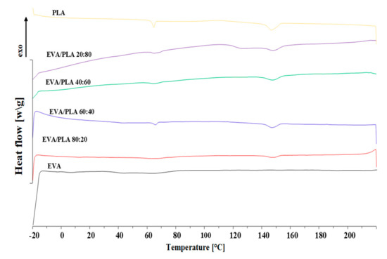 DSC thermographs of the first heating for pure EVA, PLA, and EVA/PLA blends.