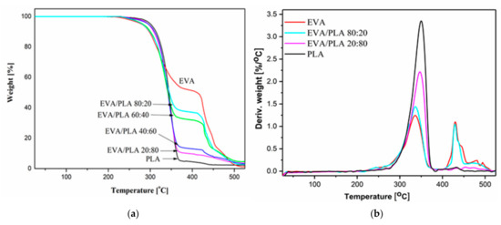 TGA curves of pure EVA, PLA, and blended EVA/PLA samples (a), and DTG curves for pure EVA, PLA, and selected blended samples (b).