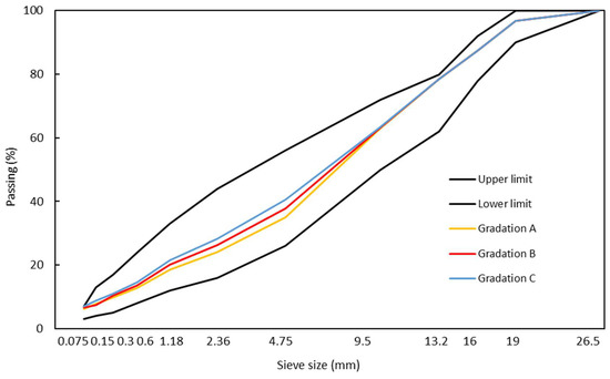 The asphalt mixture designed in this research was used for the middle layer of asphalt pavement with a maximum particle size of 19 mm. The mixture was designed based on Chinese JTG E20-2011 [23], JTG E42-2005 [24], and JTG F40-2004 [25] standards. Three aggregate gradations were designed, as shown in Figure 1. The ARA content used was 0.3% of the total weight of the mixture and first blended with aggregates before bitumen. This ARA content is the supplier’s recommended optimum dosage. The Marshall specimens were prepared by using 5 different binder contents (3.1%, 3.6%, 4.1%, 4.6% and 5.1%). The best aggregate gradation and optimum binder content were determined by considering targeting air voids of 4.0–4.5% and the highest Marshall stability. Finally, gradation B was selected as the best, and the optimum binder content was found to be 4.3% for base bitumen and 4.4% for CR-modified bitumen. The results of Marshall stability and flow of 3 selected mixes are shown in Table 5.