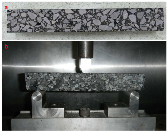 The three-point bending (3PB) test is a uniaxial loading system used to evaluate the low-temperature cracking resistance of asphalt mix [27]. The 3PB was performed according to the JTG T0715-2011 standard [23]. Before testing, asphalt mixture slabs were compacted, followed by a cutting process to obtain prismatic beams with dimensions of 250 × 30 × 35 mm3, as shown in Figure 2a. The air voids of asphalt mixture beams were measured, and these 3 types of mixture obtained similar average air voids, with values in the range of 4.1–4.5%. Before testing, these mixture beams were placed in an environmental chamber at −10 °C for at least 1.5 h to ensure homogeneous temperature distribution. During testing, the specimen was supported by 2 rollers with a span length of 200 mm, and a concentrated loading rate of 50 mm/min was applied, as shown in Figure 2b. The maximum bending strain was calculated by Equation (2):