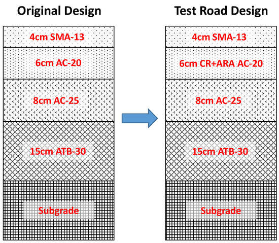 Cross-sections of the road structure: the original designed AC-20 in the middle layer was replaced by CR-modified anti-rutting AC-20.