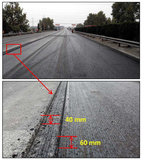 Based on the CR-modified anti-rutting asphalt mixture designed in the laboratory, a test road was constructed in September 2017. This test road was based on a maintenance project on the S31 expressway with a length of 2.2 km (K6+400~K8+600) in Taian, Shandong Province, China. The maintenance project was designed to remove the top and middle layers of the asphalt pavement, followed by paving with new asphalt mix. The CR-modified anti-rutting asphalt mixture was used in the middle layer with a thickness of 60 mm, as shown in Figure 3. The original designed AC-20 intermediate layer was used as a benchmark to compare with the anti-rutting middle layer.