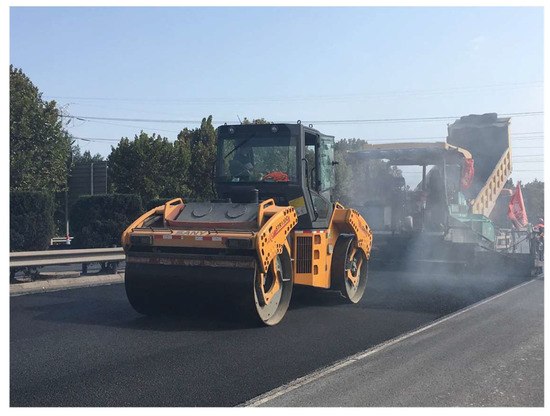 Before paving the middle layer, the substrate layer surface was cleaned to remove dust and covered with a layer of emulsified bitumen (Chinese Qilu Transportation Development Group, Jinan, China) to obtain good interface adhesion, as shown in Figure 4. The construction range included a travel lane and an overtaking lane with a width of 7.5 m. Hot mix was first dropped into the pitch paving, with the temperature not less than 165 °C. During the paving process, the coefficient of compaction was 1.34 and the speed was controlled at 3 m/min. Two Sany STR130C-6 (Sany Heavy Industry, Changsha, China) road rollers followed closely behind the pitch paver to finish the first compaction immediately after paving, as shown in Figure 5. At least four cycles of compaction were applied to obtain the required degree of compaction.