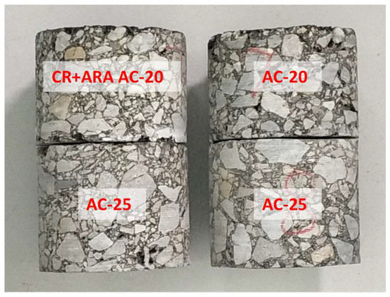 Eight cored samples with a diameter of 100 mm were collected in four locations after the middle layer construction was completed. Four cores were used to determine the ITS, and another four cores were used to evaluate the compressive strength and resilient modulus. Another eight cored samples were collected from the original designed AC-20 layer and the same tests were performed as with the anti-rutting mixture. The cored samples were then cut and trimmed to obtain cylindrical specimens, as shown in Figure 6. The anti-rutting mixture and the normal AC-20 layer were placed on top of the existing AC-25 underlayer. Because of the matching aggregate gradation, the anti-rutting mixture and the normal AC-20 mixture showed almost equivalent skeletal structure.