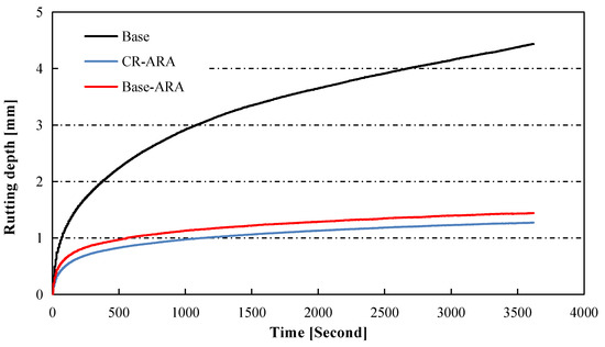 It can be seen that the rutting depth of asphalt mix increased gradually when the repeated loading time was prolonged, and the base asphalt mixture obtained the greatest rutting depth. The addition of ARA significantly decreased the rutting depth of the asphalt mixture, while the incorporation of CR helped to slightly reduce the rutting depth.