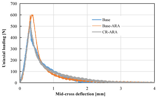 Plots of mid-cross deflection versus uniaxial loading of all specimens.