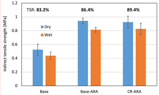 The indirect tensile strength of asphalt mix before and after the freeze-thaw cycle was measured and the retained tensile strength ratios were calculated, with the results presented in Figure 9. In dry conditions, the asphalt mixture prepared with the base bitumen showed the lowest ITS of 0.524 MPa. With the addition of ARA, ITS increased to nearly twice that of the base asphalt mixture. This can be attributed to the formation of two interlocked continuous phases in the bitumen, resulting in improved strength of the asphalt mixture. ARA significantly improved the tensile strength of the asphalt mixture, which may contribute to rutting and cracking resistance of asphalt pavement. However, CR-ARA obtained nearly the same ITS value as Base-ARA. It is suggested that CR has no further contribution to the ITS value of anti-rutting asphalt mixture.