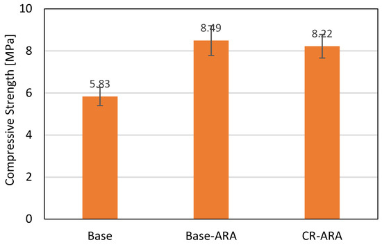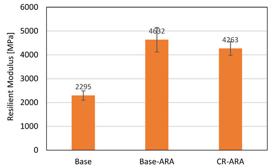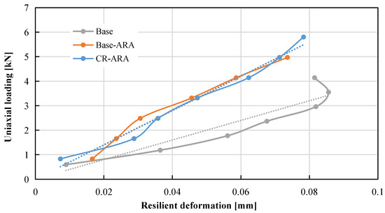 The relationship between uniaxial loading and resilient modulus of related specimens is shown in Figure 10. It can be observed that the seven points selected in this test are all located on one trend line. The compressive strength and resilient modulus were calculated based on Equations (5) and (6), as shown in Figure 11 and Figure 12, respectively. In terms of compressive strength, the asphalt mixture prepared with the base bitumen obtained the lowest result (5.83 MPa), and the mixture prepared with ARA had the highest (8.49 MPa). Such results indicate that the addition of ARA improved the resistance of asphalt mixture to vertical loading. The addition of CR in the anti-rutting asphalt mixture slightly decreased the compressive strength. Considering the standard deviation, Base-ARA and CR-ARA obtained similar compressive strength. This phenomenon reveals that ARA is the main factor in improving compressive strength and CR does not contribute to this parameter.