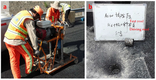 After test road compaction, the cored specimens were collected by using a core-drilling machine, as shown in Figure 13a. The core locations and thicknesses of cored specimens were recorded, as shown in Figure 13b. The properties of the cored specimens were evaluated, and the results are presented in Table 9. The degree of compaction was the proportion of bulk specific gravity of the cored specimen divided by bulk specific gravity of the Marshall specimen. As presented in this table, the degree of compaction and thickness of these two test roads met the design requirements. The ITS results were similar to the laboratory study, which indicates that the CR-ARA asphalt mixture had a higher value. The addition of ARA improved the stiffness of bitumen, which resulted in enhanced strength of the asphalt mixture. However, in terms of the same asphalt mixture, the cored specimen obtained relatively lower ITS value compared with the laboratory specimen. One reason could be the specimen dimensions, with the height and diameter of cored specimens differing from those of the Marshall specimen. Another reason could be that the cored specimen destroyed the continuous structure of the compacted road, and the aggregates on the side walls were not restricted by binders. Regarding the compressive strength and resilient modulus, higher values were also related to the CR-ARA asphalt mixture. The improvement of compressive strength and resilient modulus can be attributed to two major factors. First, the addition of ARA (plastomers) creates two interlocked continuous phases and results in increased stiffness. Second, owing to the contribution of CR, a rubbery support network is formed and results in improved elastic response [12]. As a consequence, it can be anticipated that the CR-modified anti-rutting asphalt pavement would be more durable than the base asphalt pavement.