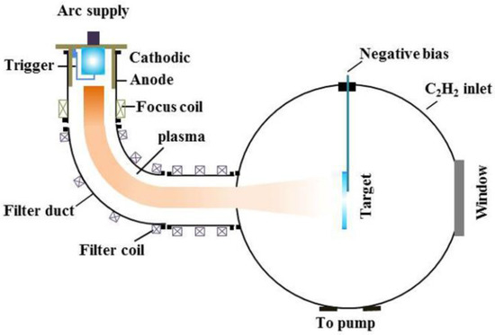 The schematic diagram of the FCVA (filtered cathodic vacuum arc) deposition system.