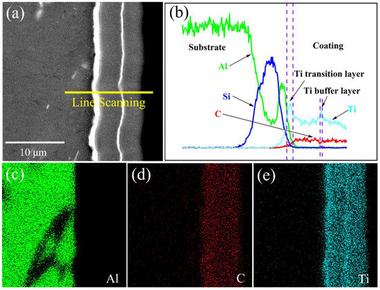 Figure 2 shows the SEM cross-sectional morphology of the Ti-DLC coatings with different Ti transition layer deposition time (T). The Ti layer and the Ti-DLC layer can be clearly delineated on the Al alloy. When T increases from 0 to 20 min, the Ti transition layer thickness t0 is about 0, 0.5, 1.1 and 2.8 μm, respectively. There is a positive correlation between the t0 and T, that is, the t0 increases linearly with the linear increases of T, indicating that the Ti transition layer can be obtained efficiently and stably by FCVA. Except for sample 1, the thickness of the Ti buffer layer and the Ti-DLC layer for all samples are about 0.5 and 4.2 μm, respectively. In addition, the overall thickness of all samples is about 10 μm except that sample 1 is about 5 μm, as shown in Table 1. Therefore, it can be preliminarily concluded that the Ti transition layer is beneficial to the growth rate of the Ti-DLC coating. Some inhomogeneity and defects, which were probably formed during grinding and polishing, can be observed in the SEM cross-section images given. In order to further analyze the chemical composition of the Ti-DLC coating, EDS maps are given by scanning along the specified line and cross-section (Figure 3). There is a smooth and clean cross section without an abrupt interface, indicating excellent adhesion properties of the Ti-DLC coating. Figure 3b shows a compact structure of the Ti-DLC coating with the Ti transition layer/Ti-DLC layer/Ti buffer/Ti-DLC layer, which is consistent with the experimental design. Typically, from left to right of the scan, the Ti element in the Ti layer first increases and then decreases in the Ti-DLC layer. A sudden rise in the abundance of Al and Si is also observed in the vicinity of substrates. Furthermore, mutual diffusion of Ti and C elements at the layer inter interfacial boundary of the substrate, the Ti layer and the Ti-DLC layer, is clearly recognized (Figure 3b–e). This diffusion results in a distribution gradient effect near the interface of the layer and serves to enhance the interfacial adhesion of the coating [25].