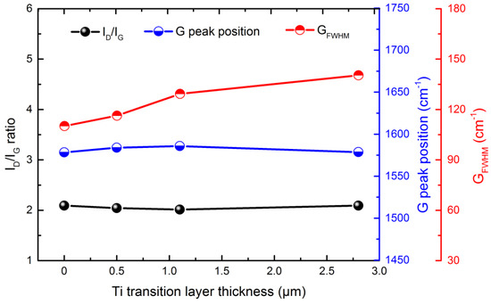Corresponding ID/IG ratio, G peak position and GFWHM of Ti-DLC coatings with Ti transition layer thickness (t0): (a) 0 μm, (b) 0.5 μm, (c) 1.1 μm and (d) 2.8 μm.