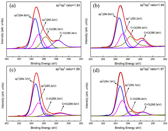 C1s XPS spectra fitting results and sp2/sp3 ratio of Ti-DLC coatings with Ti transition layer thickness (t0): (a) 0 μm, (b) 0.5 μm, (c) 1.1 μm and (d) 2.8 μm.