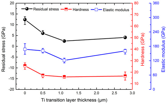 The residual compressive stress of the Ti-DLC coatings as a function of the Ti transition layer thickness t0 (μm) is presented in Figure 9. It can be observed that when t0 increases, the residual compressive stress decreases sharply from 12.4 GPa at 0 μm to 2.4 GPa at 1.1 μm, which serves as evidence that the residual compressive stress causes the G peak shifting upward to a higher wavenumber as in previous Raman studies [40]. As we know, this strain is produced by different shrinkage tendencies owing to the direct contact between the coating and Al alloy substrate. The Ti transition layer acts as a buffering action on strain, which is the reason of the decrease in residual compressive stress. However, as t0 increases continuously, the residual compressive stress slowly increases, which may be the consequence of an increase in thermal stress in the coating. The results show that suitably changing the Ti transition layer thickness can effectively adjust residual compressive stress of coatings, which agrees with the report of Liu et al. [25]. Moreover, we found that as the value of t0 increases, the measured values of hardness and elastic modulus exhibit a decreasing tendency. When t0 increases from 0 to 1.1 μm, the hardness value decreases from 25 GPa to 16 GPa, and the elastic modulus value gradually decreases from the maximum value of 168 GPa to the minimum value of 122 GPa. Then, when t0 further increases to 2.8 μm, the hardness value does not significantly change, and the elastic modulus value of the coating increases to 160 GPa. According to the results analysis, the hardness and elastic modulus are dependent on the Ti transition layer thickness.