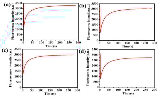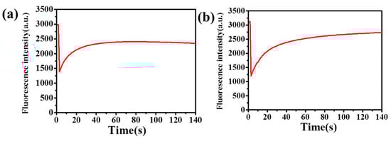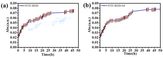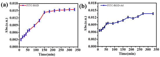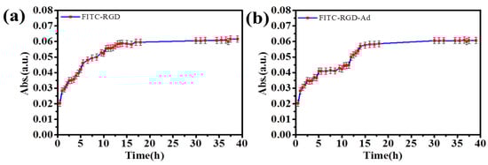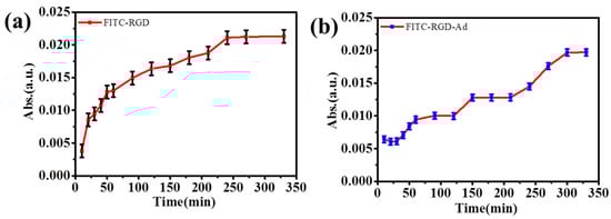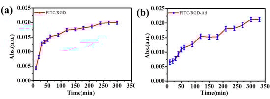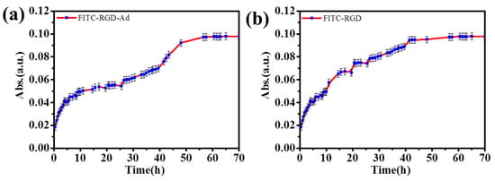 As shown in Figure 9, at first, the release rate of the peptide increased slowly and then increased rapidly. The quick release time of fluorescent probe was not long. However, as the number of (PAH/HA–CD)n laminated multilayer films increased, the release speed of mixed fluorescent probes slowed down, and the release time also increased. Because there was no host–guest interactions between the FITC–RGD and HA–CD, the release speed of the FITC–RGD was not delayed by the supramolecular force since the solution was a mixed solution of the FITC–RGD and FITC–RGD–Ad. First, due to host–guest interactions, the release rate of the fluorescent probe in the solution was slower. When passing through the mesoporous silica region, both fluorescent molecules were not affected by the host and guest interactions, resulting in a rapid increase in the release rate. Subsequently, when the fluorescent probe passed through the HA film, the release rate of the fluorescent probe decreased again. The reason was that there was a kind of a host–guest interaction between the FITC–RGD–Ad and the HA–CD. It indicated that the mixed fluorescent probe was an effective method for laminated multilayer films. The more the laminated multilayer films, the greater the host–guest interactions. The reason behind the masking of the fluorescent probe was the host–guest interactions between the HA–CD and the Ad, delaying the release speed of fluorescent molecules, therein.