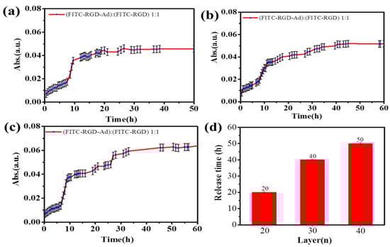 The release profiles of mixed solution of FITC–RGD and FITC–RGD–AD (V:V = 1:1) from (a) (PAH/SiO2)1/(PAH/HA–CD)20/(PAH-SiO2)1/(PAH/HA–CD)20; (b) (PAH/SiO2)1/(PAH/HA–CD)30/(PAH/SiO2)1/(PAH/HA–CD)30; (c) (PAH/SiO2)1/(PAH/HA–CD)40/(PAH/SiO2)1/(PAH/HA–CD)40 laminated multilayer films; (d) the release time of different laminated multilayer films (n = 20, 30 and 40).
