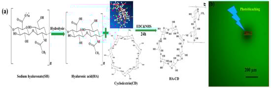 (a) The synthesis process of HA-CD hydrogel; (b) the prepared HA-CD hydrogel was used in the fluorescence recovery after the photobleaching (FRAP) experiment.
