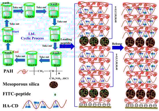 Illustration of the construction of the short peptide retention and the release of multilayers, using the Layer-by-layer (LbL) technique: Multilayer films were prepared on the surface of the quartz plate via a layer-by-layer self-assembly technique. The prepared multilayer films were used to load the peptides. Both the laminated layer and the mesoporous silica reservoir were indispensable in obtaining the functional laminations. The capping layers were (HA-CD/Poly(allylamine hydrochloride (PAH))n woven multilayers.