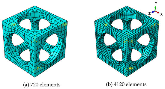 where is the displacement vector, is the coordinates of nodes and is the strain load applied on the RVE. The notations + and − denote the nodes on opposite boundaries; the notation represents the incremental case. Thus, a set of reference points (RPs) for three different directions is introduced in MPCs and the meshes on the opposite boundaries must be the same in order to create periodic boundaries; see Figure 1. Both the continuum 3D solid element with full integration (labeled C3D8 on ABAQUS) and continuum 3D solid element with reduced integration (labeled C3D8R on ABAQUS) for the mesh in Figure 1a are studied in order to optimize the computation efficiency on the RVE. Following the constitutive model introduced in the last subsection, the material parameters of a conventional NiTi alloy are given in Table 2, which are identified with the experimental data of Sittner et al. [43].