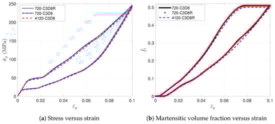 To describe the effective behavior of RVE, the averaged values, such as stress , strain and martensitic volume fraction , are introduced. The averaged values are computed by volume averaging over the whole 1 mm cube from Element 1 to N, where N denotes the total element number. Note the averaged strain is equal to the prescribed strain due to the periodic boundary conditions, Equation (9). Figure 2a shows the stress-strain relations simulated with different meshes and element types. The hysteresis effect is observed during the loading/unloading cycle. This nonlinear response is caused by the inner forward phase transformation of SMA. The averaged martensitic volume fraction increases along with the loads until reaching a maximum value; see Figure 2b. When the unloading begins, decreases immediately until recovering to zero. From the comparison of the curves, it is observed that the mesh with 720 elements is fine enough to model this architected SMA RVE. Furthermore, the RVEs simulated by the C3D8R and C3D8 elements have exactly the same responses; see Figure 2.