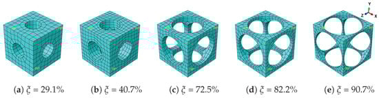 In this subsection, five types of RVEs with different void volume factions are studied, as illustrated in Figure 3. The size of the cube is given by 1 mm × 1 mm × 1 mm, while the radius of the cylindrical hole varying along with is given in Table 3. The material parameters of SMA remain the same as those in the last subsection.