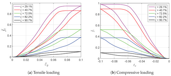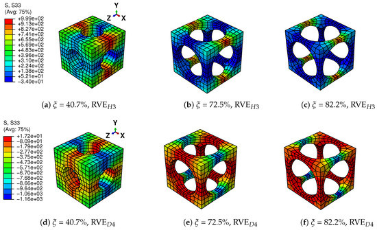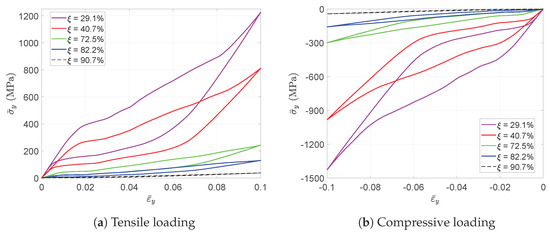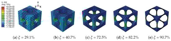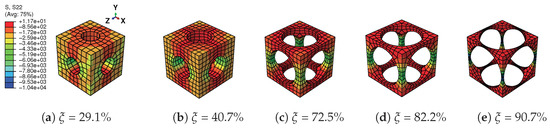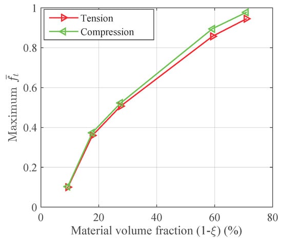 A tensile strain up to 10% and a compressive strain up to −10% in the Y direction are respectively applied on the RVEs to simulate effective responses for different RVEs. Figure 4 gives the curves of averaged stress versus the averaged stain along the loading direction, simulated by the above RVEs respectively. The absolute value of stress in different RVEs at a certain strain level increases along with the decreasing of the void volume fraction, as depicted in Figure 4. In more detail, Figure 5 gives the relation of maximum stress and material volume fraction (1-) when the absolute value of strain is up to 10%. The trend of the curve shows that the higher the material volume fraction is, the faster the stress increases. This trend could be explained by exploring the stress distribution on the RVE at the maximum strain level 10%, as shown in Figure 6 and Figure 7. The high stresses are mainly distributed over the middle of the pillars along the loading direction. Lower material volume fraction results in a stronger stress concentration effect. Thus, the stiffness of the RVE decreases more rapidly than the material volume fraction. This test could be a reference for designers to balance the stiffness and the mass of the architected structure.