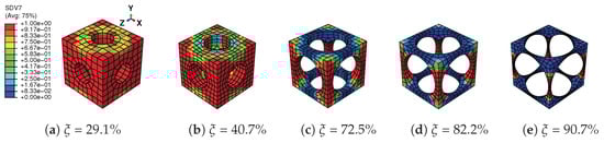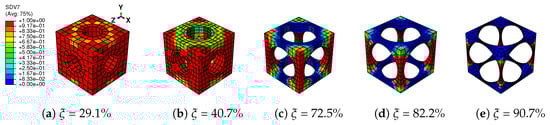 Figure 8 gives the martensitic volume fraction averaged over SMA versus the strain averaged over the cube. The martensitic volume fraction increases along with the increasing of the strain level, but stops before it reaches one. More specifically, each RVE has a certain maximum value in this loading case. The maximum martensitic volume fraction versus the material volume fraction at the maximum absolute strain level of 10% is depicted in Figure 9. It shows that the lower the material volume fraction is, the more rapidly the martensitic volume fraction decreases. This also means the usage rate of SMA is at a very low level when the material volume fraction is low, and it could result in a waste of SMA. For example, the hysteresis effect of the SMA architected structure is not proportional to the SMA mass, but to the product of the SMA mass and the SMA usage rate. Thus, the hysteresis effect could be very weak when the SMA usage rate is very low. Like the stiffness discussed before, this phenomenon could also be explained by the stress concentration where only the high stress area transforms into martensite; see Figure 10 and Figure 11. This also means SMA cannot completely transform from austenite into martensite. Thus, as long as the unloading begins, the reverse transformation starts immediately, resulting in the reduction of .