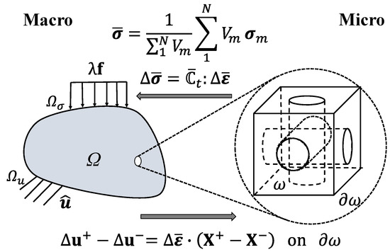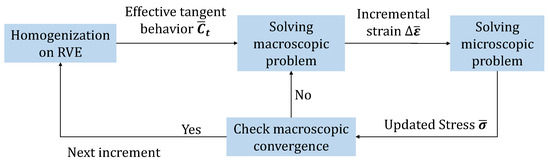 As the macroscopic constitutive behavior on each integration point is not clear, it has to be represented by the effective behavior of the associated RVE at each macroscopic increment. A brief flow diagram, showing how this multiscale problem is solved, is illustrated in Figure 15. Specifically, the effective behavior of the RVE is computed by seeking the relations between the averaged stresses and averaged strains over the RVE via a series of loading tests. Once the effective behavior is obtained, the macroscopic problem is to be solved. Considering the nonlinear response of the RVE during loading, the macroscopic convergence has to be checked in each macroscopic iteration of the Newton–Raphson framework. In an iteration, the strain states of RVEs are updated with the macroscopic strains, and in return, the macroscopic stresses are renewed by updating the averaged stress of the RVE at the new strain states.