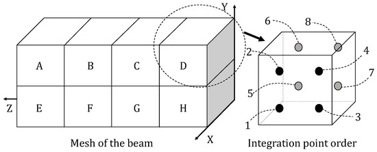 The meshes for the left half beam and the integration points in each C3D8I element.
