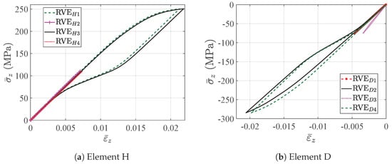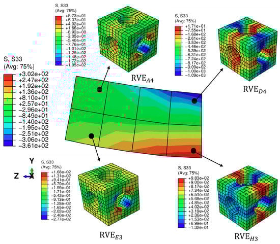 Let us consider the case with volume fraction = 40.7%. The stress distribution of the bending beam with the prescribed displacement in the Y direction reaching 0.5 mm is illustrated in Figure 16. The deformations of both the macroscopic and microscopic structures are magnified by three times. The high compressive stresses in the Z direction are observed in the elements above the middle plane Y = 2.5 mm, while in contrast, the compressive stresses are observed in the elements below the middle plane. In the meantime, for different macroscopic points, the RVEs have different stress states in correspondence with their associated macroscopic strain states. To specify the microscopic structure more clearly, we introduce RVE to denote an RVE corresponding to the integration point l of the macroscopic element k. The RVEs above the middle plane, such as RVE and RVE, are mainly subjected to compression, while the RVEs below the middle plane, such as RVE and RVE, are mainly subjected to tension. The stresses in the RVEs far from face Z = 10 mm, such as RVE and RVE, are at a relatively low level compared to those RVEs near face Z = 10 mm, such as RVE and RVE.