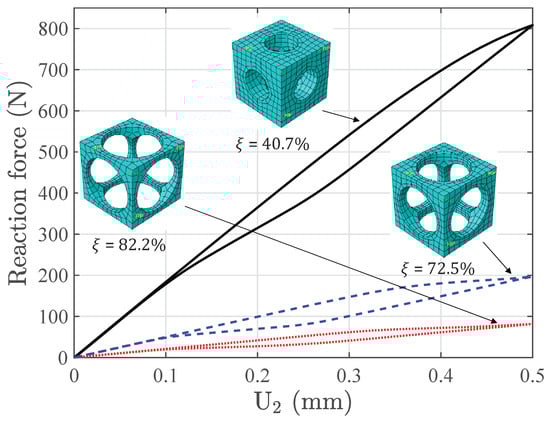 Figure 17 shows the nonlinear response of the macroscopic structure with three different void fractions. The linear response is observed at the very beginning, and the microscopic structures deform without any phase transformation. As the loading increases, the forward phase transformation begins over the high stress area of the beam. For example, Figure 18 gives the stress strain relations of integration points in element D and element H with = 40.7%, which also represent the effective behavior of the associated RVEs. Note that Integration Points 5 to 8 in each element are not illustrated considering the symmetry of the structure in the middle plane X = 2.5 mm. It is observed that the hysteresis effects in RVE and RVE are relatively much more obvious than those in RVE and RVE; because RVE and RVE are located in the high stress area. The martensite transformation states of the RVEs with the prescribed displacement in the Y direction reaching 0.5 mm, shown in Figure 19, also give a reasonable confirmation from the RVE level. This figure depicts the RVEs corresponding to these integration points closest to the face Z = 10 mm. Only the RVEs far from the middle plane Y = 2.5 mm have an obvious phase transformation. Simultaneously, the phase transformation at the RVE level is accompanied by the softening of macroscopic stiffness. This softening goes gradually, because the thermomechanical phase transformations at the microscopic level are not synchronous, considering that the stress states of the macroscopic structure are not uniform over the whole beam and that the microscopic structure is architected. Once the unloading begins, the behaviors of the structure and RVEs immediately turn into the linear case. Later, the reverse transformation follows, and finally, all the phases transform back into austenite.