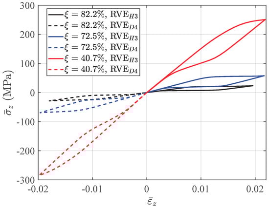The differences between structural responses with three void fractions are observed in Figure 17. With a higher void fraction, the macroscopic structure shows lower stiffness and a weaker hysteresis effect, because the macroscopic behavior is represented by the mean behavior of the microscopic structures. The stress-strain relations of Integration Points H3 and D4, which are also the averaged stress-strain relations of RVE and RVE, are depicted in Figure 20 to investigate the microscopic response of the structure. Figure 21 gives the stress distributions in the Z direction for associated RVEs at maximum loads corresponding to the displacement of the beam ends U = 0.5 mm. It is observed that the averaged stiffness and the hysteresis effect of the RVE with a higher void fraction are lower than those of the RVE with a lower void fraction, which is consistent with the response at the macroscopic level. As we have discussed in Section 2, the high void fraction results in less SMA, which can provide low stiffness for the structure. For this architected structure, the stresses are concentrated over the pillars along the main loading direction when the void fraction is high. This also results in the martensite phase being mainly concentrated over the pillars.