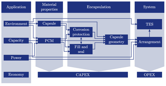 This section describes the novel strategy for the development of macro-encapsulated TES. The strategy is based on the analysis of various publications in the field of macro-encapsulation and the experience of the authors gained in different encapsulation projects. The flowchart of the proposed workflow is depicted in Figure 1. The process is divided into four main levels: application, material properties, encapsulation and system. Each level and its set of parameters as well as the influences among each other are described in the following sections with special focus on the encapsulation process.
