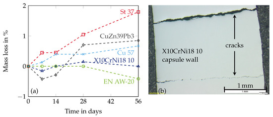 Results of the corrosion experiments with MCHH and various metals at a temperature of 122 (a) and scanning electron microscope recording of a capsule made of stainless steel (b). Reproduced with permission from Brüggemann et al. [30].