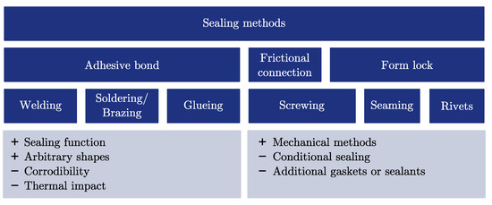 The chosen PCM determines the fill and seal (Figure 1) process of the capsule; for example, as a solid block or powder or in its liquid state. A collection of various sealing methods is depicted in Figure 4. The methods are categorised in adhesive bondings, frictional connections and form lock methods. The chosen capsule material influences the possibilities of sealing the capsule; for example, if it is feasible to apply welding, soldering or adhesive bonding for the sealing process. It should be considered that the corrosion protection and the fill and seal process have to be compatible with each other. Welding or soldering may require high temperatures above the decomposition or ignition temperature of the PCM and the corrosion protection layer.